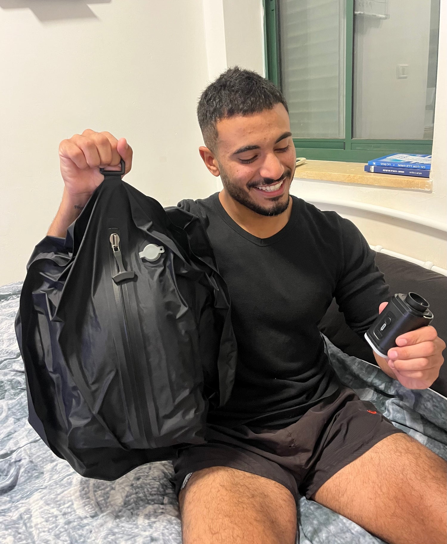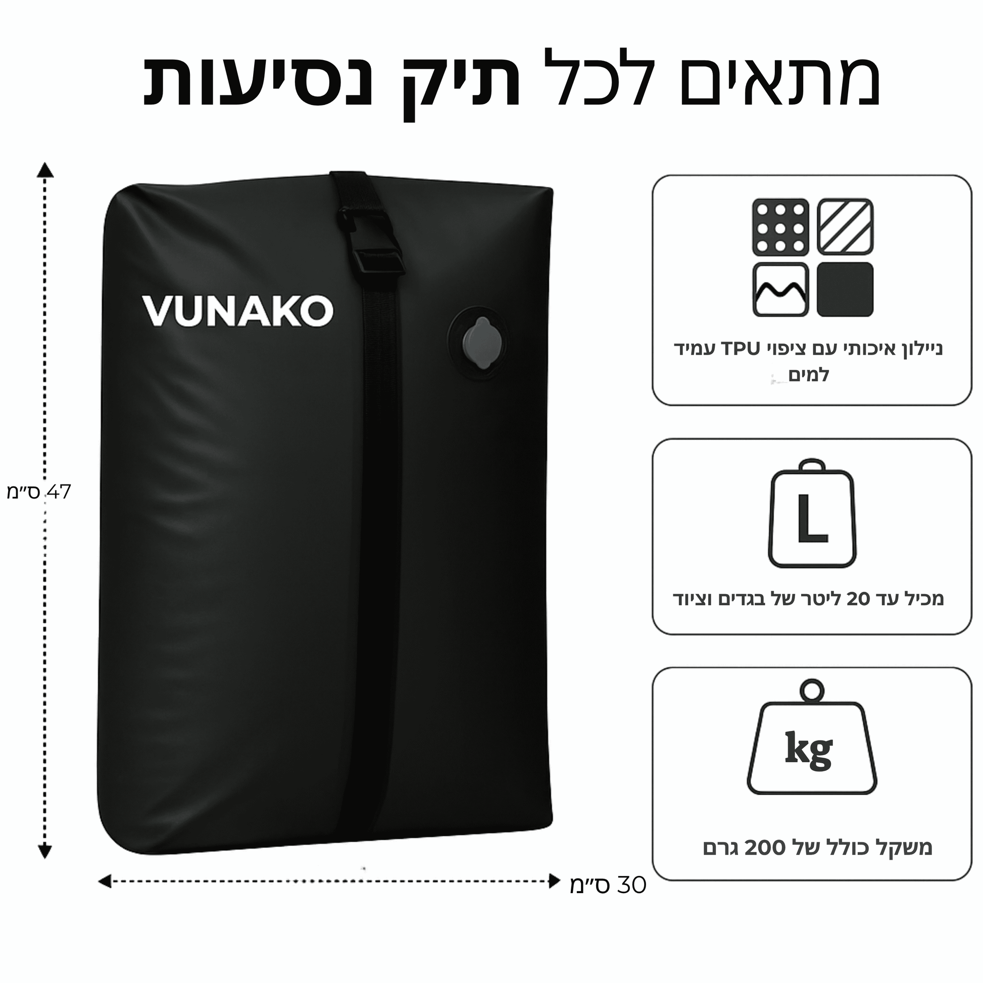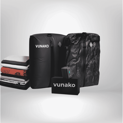 המשאבה החשמלית הנטענת של VUNAKO דוחסת את הבגדים שלך לחצי מהנפח שלהם תוך 10 שניות בלבד. אפשר להשתמש בה במלון, בשדה התעופה או באוהל בכינרת– ואין צורך בשקע חשמל, הסוללה מספיקה לעד 20 שימושים בטעינה אחת.